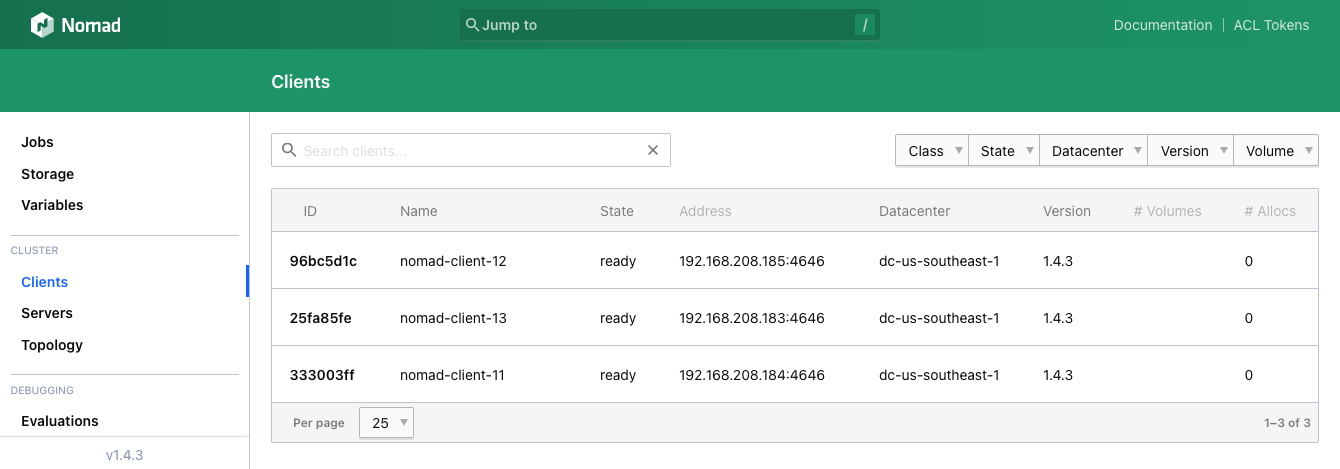 7. Navigate to the Clients page from the same menu to see a list of the deployed Nomad clients: