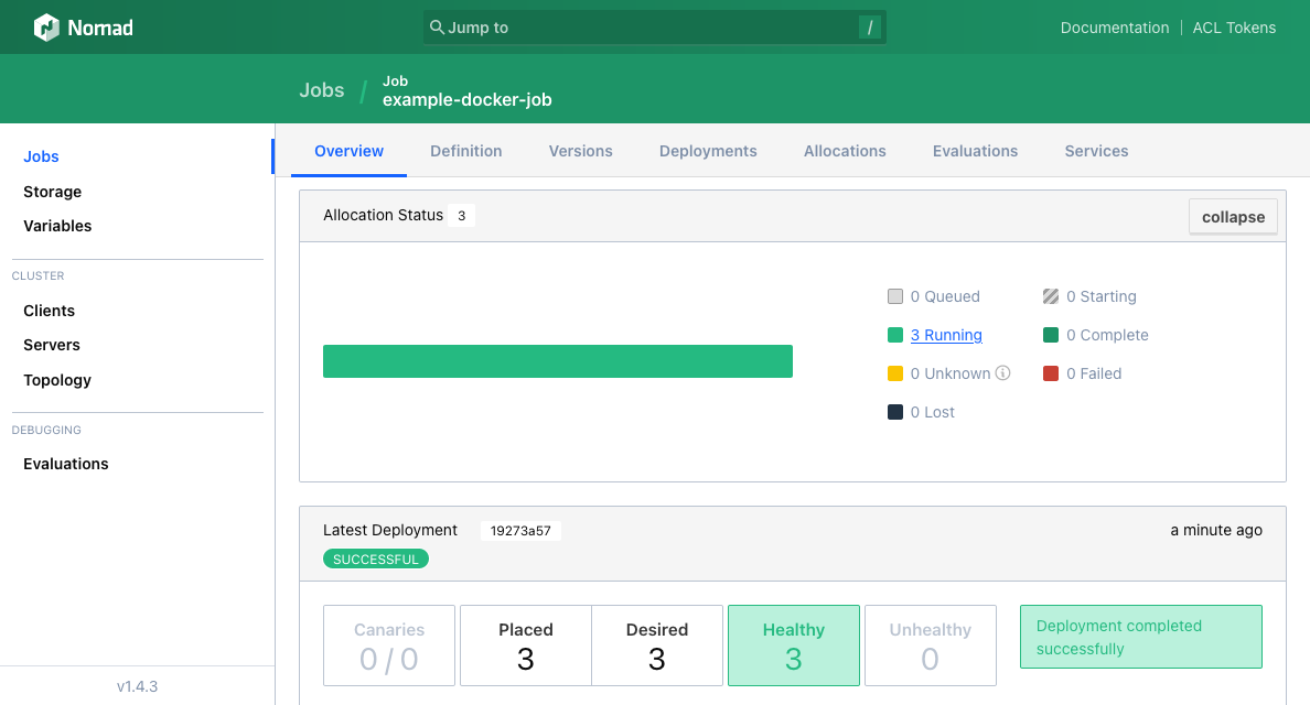 This creates a job named example-docker-job and a group of three docker-server tasks to start up HashiCorp’s http-echo Docker image on three client nodes.