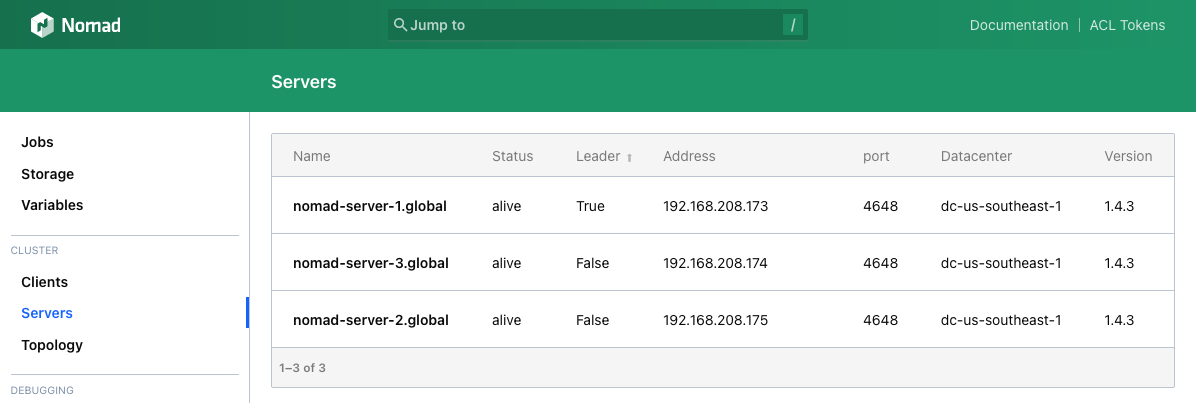 Nomad server nodes listed in the web interface